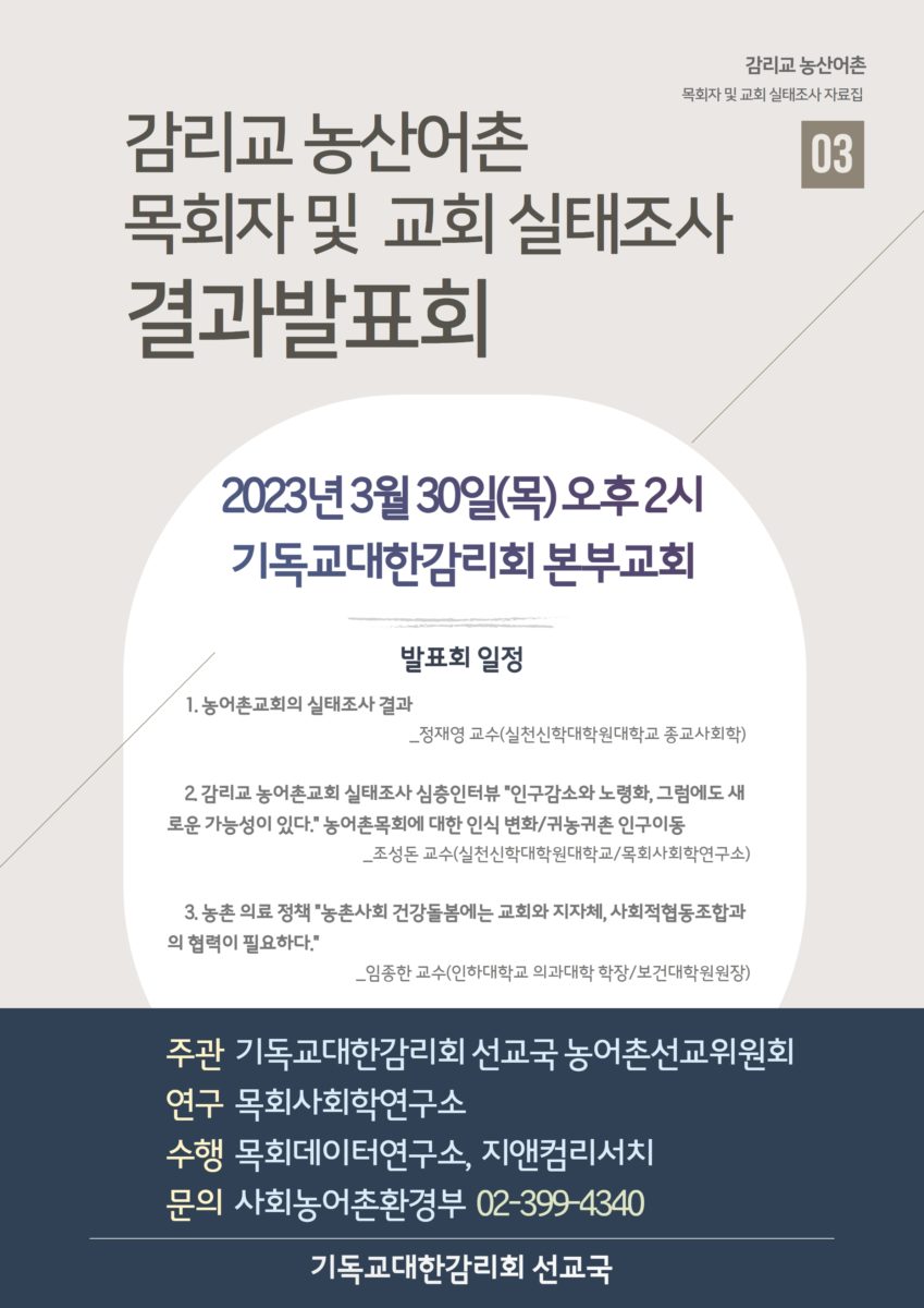 연합감리교회 장정에 감리교회에서 사용하도록 만든 좋은 교독문(연도) 2건 1.세계적인 감리교회를 위한 성약 교독문(연도) 2. 사회신경과 동반하는 교독문(연도) 첨부파일 감리회-농산어촌-목회자-및-교회실태조사.jpg 실태조사-보고서.pdf 실태조사-결과-자료집.pdf cov.sc_.zip