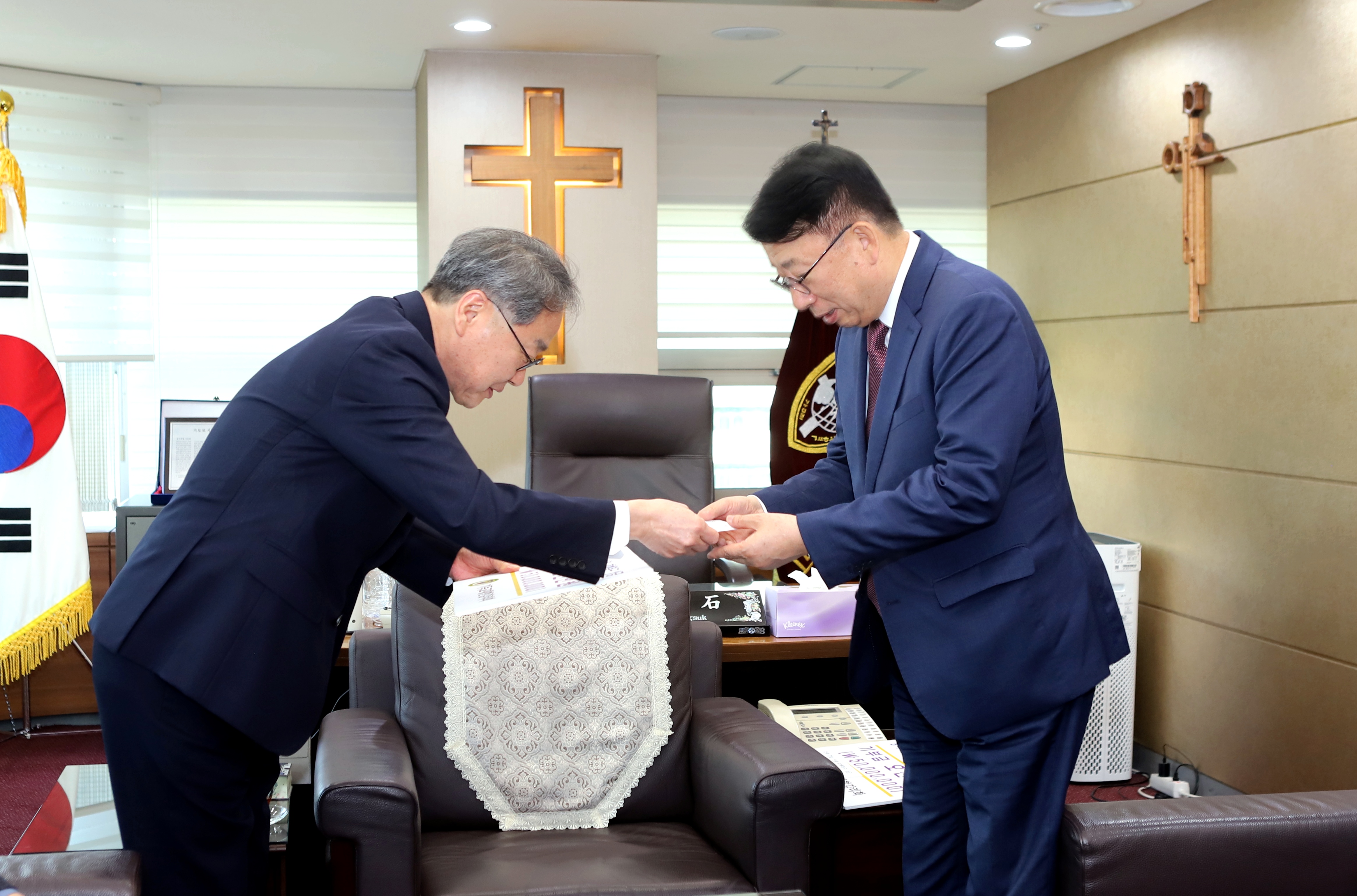 이어 김정석 감독회장이 먼저 예장통합 김영걸 총회장에게 5천만 원의 성금을 이체한 영수증과 함께 푯말을 전달한 후 예장합동 김종혁 통회장에게도 5천만 원을 전달했다. 성금을 전달한 후 담소를나눈 김정석 감독회장과 김영걸 총회장, 김종혁 총회장은 만찬장으로 자리를 옮겼다.
