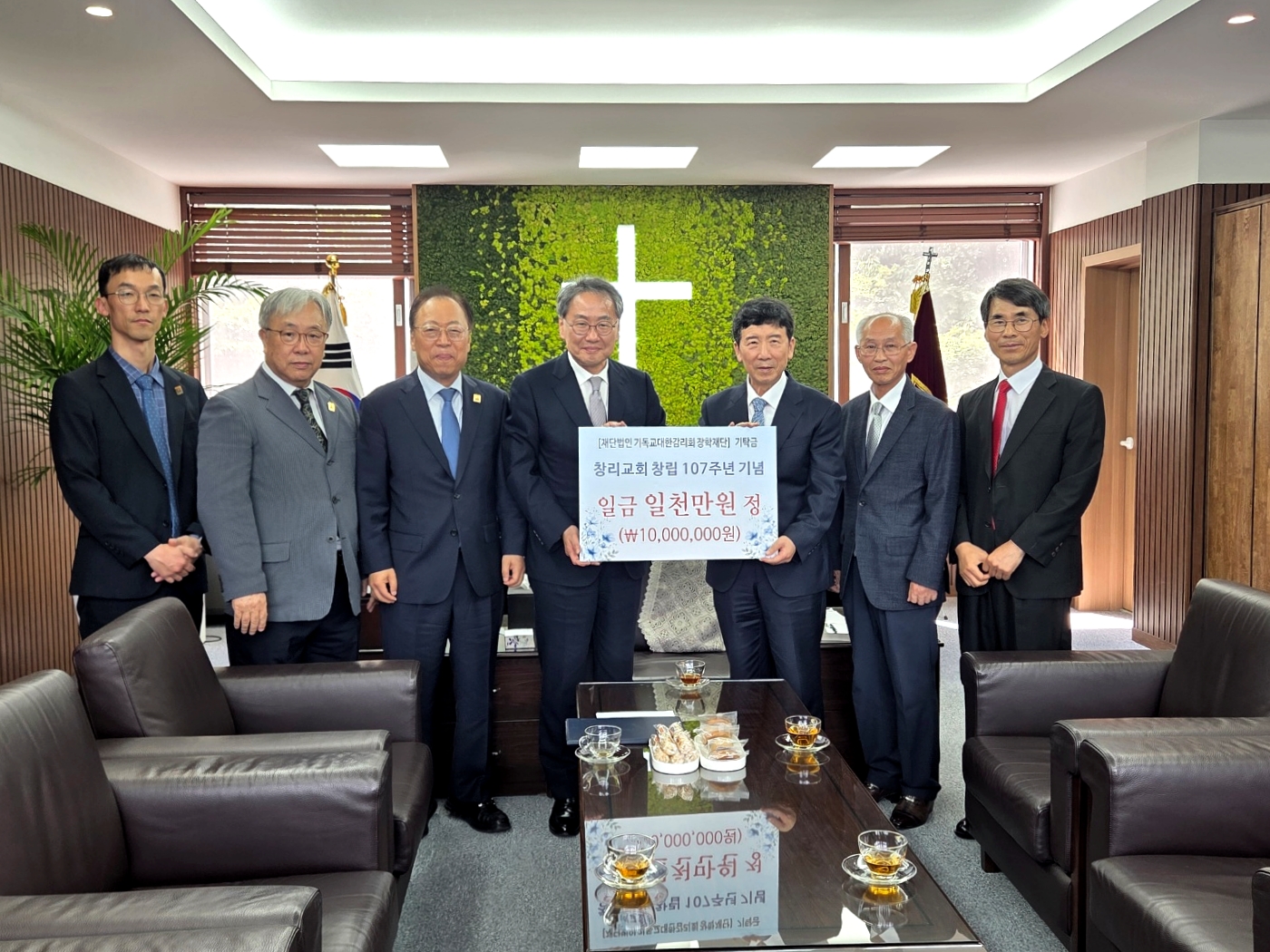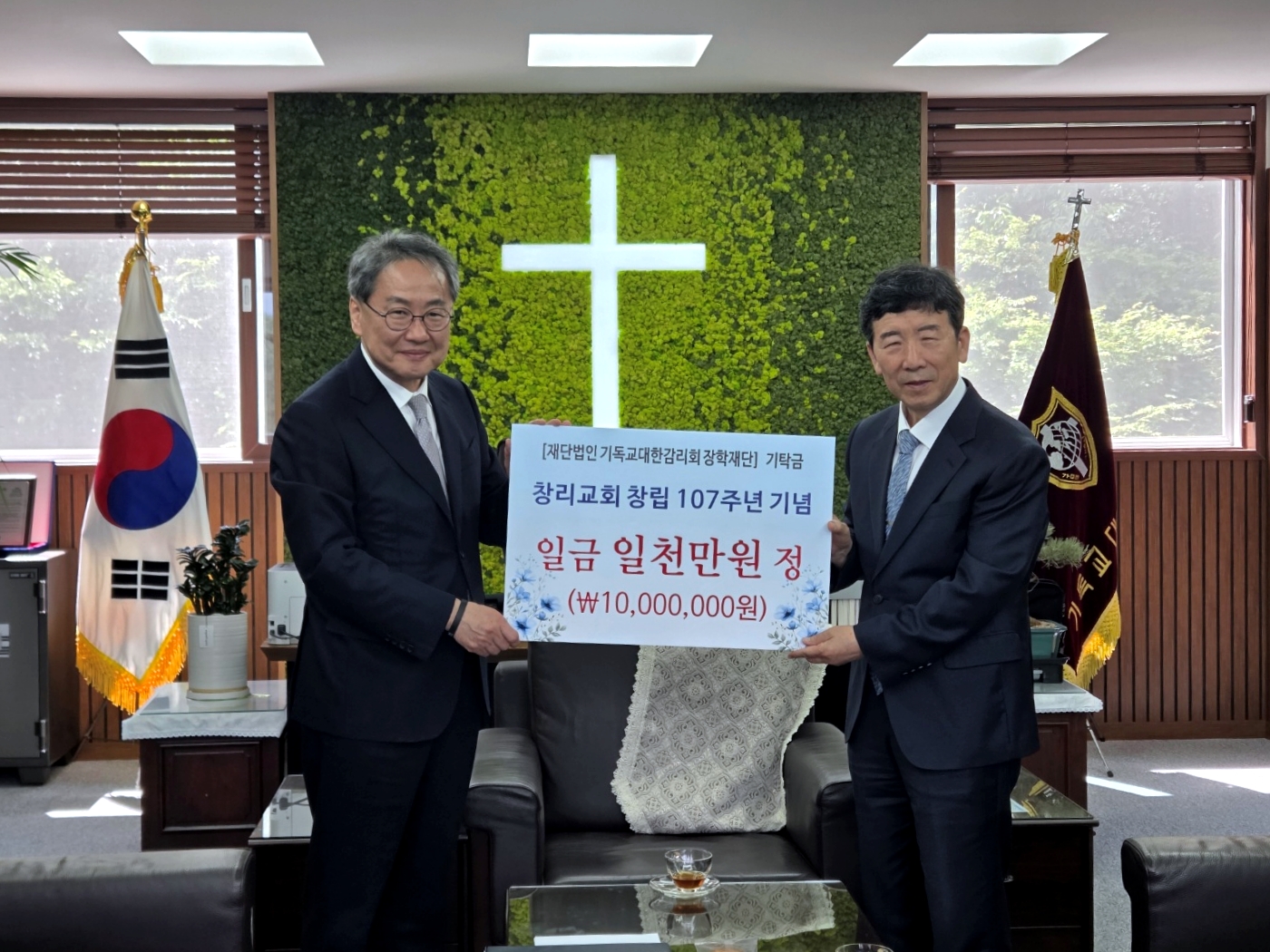창리교회 원영관 목사와 고병섭 원로장로(교회사 편찬위원장), 전종한 원로장로(107주년 준비위원장)가 지난 5월 4일(수) 오후 감리회 본부를 방문해 김정석 감독회장을 만나 감리회 인재 양성에 사용해 달라며 1천만 원을 기탁했다. 이는 감리회 본부 교육국 산하 장학재단에 귀속돼 향후 미자립교회 목회자의 자녀들 중 신학생들을 위한 장학금으로 사용될 전망이다. 이 자리에는 교육국 김두범 총무와 행정기획실장서리 함영석 목사, 그리고 기획홍보부장 황기수 목사와 장학재단 실무자인 교육행정부장 윤석호 목사가 배석했다.