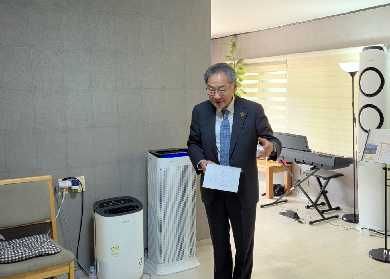 이어 다시 만나 기쁘다며 거듭 반가움을 전하면서 김덕영 전도사의 ‘힘’ 있는 설교에 은혜 받았다고 감사의 마음을 표현했다. 그리고 지역상황에 관해 김덕영 전도사의 설명을 들으면서 열악한 환경임을 새삼 느꼈다며 영적으로 혼잡한 지역 상황에서 이단세력과 영적싸움을 벌이며 복음 전파를 위해 수고하는 헌신에 위로와 격려를 드린다고 전했다. 계속해서 “여러분의 기도와 애씀이 개체교회를 넘어 감리교회 전체를 세워가는 일이다.”라고 강조한 후 기도와 응원에 어긋나지 않도록 주어진 책무를 꿋꿋이 해 나가겠다고 힘주어 말했다.