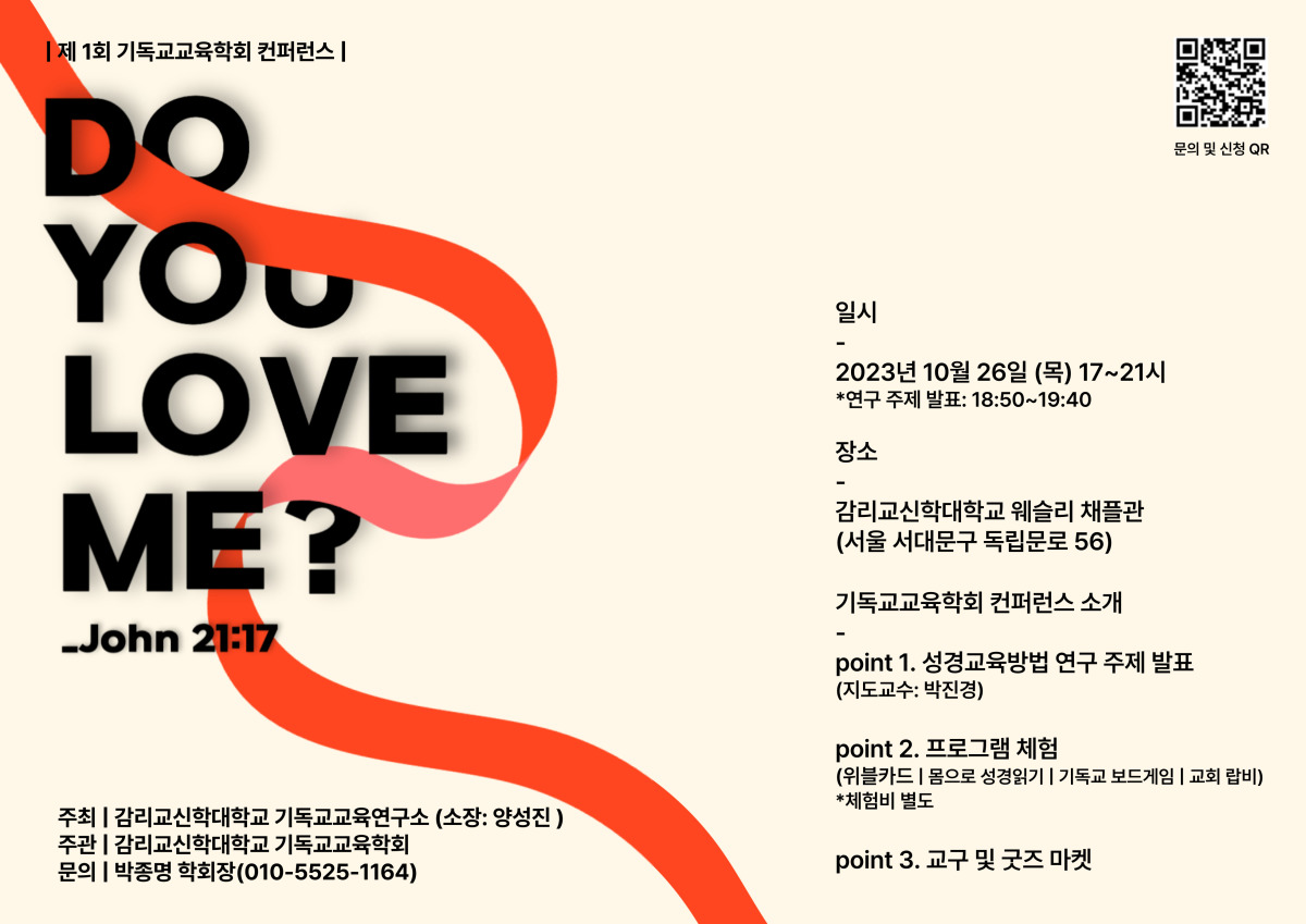 감리교신학대학교 기독교교육연구소(소장 양성진 교수)의 기독교교육학회는 2023년 10월 26일(목)에 감리교신학대학교 웨슬리 채플에서 “Do You Love Me?(John 21:17)”라는 주제로 제1회 기독교교육 컨퍼런스를 개최한다. 기독교교육 컨퍼런스는 기독교교육연구소(주최)의 기독교교육학회 주관으로 열리며, 현재 양성진 교수와 박진경 교수가 지도교수를 맡고 김영래 교수가 전공교수로 참여한다.