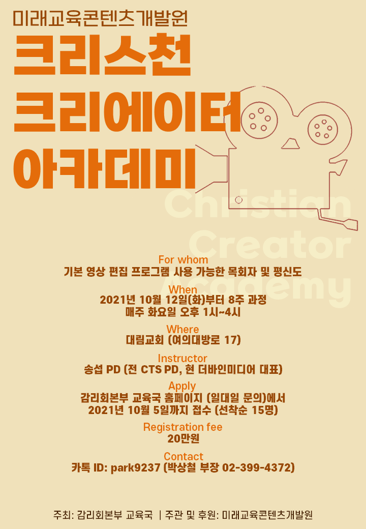 코로나 팬데믹으로 비대면이 일상화되고 온라인 예배가 드려지고 있습니다. 또한 교회 현장에서 어린이들을 비롯한 전 연령층 신앙교육을 위한 영상 콘텐츠가 절실히 요구되고 있습니다. 본부 교육국(총무: 김두범 목사)과 미래교육 콘텐츠개발원(원장: 박동찬 목사)은 크리스천 크리에이터 양성을 위한 아카데미를 준비하였습니다. 기독교 영상 콘텐츠 제작과 온라인 교육에 관심 있는 분들의 적극적인 참여를 부탁드립니다.