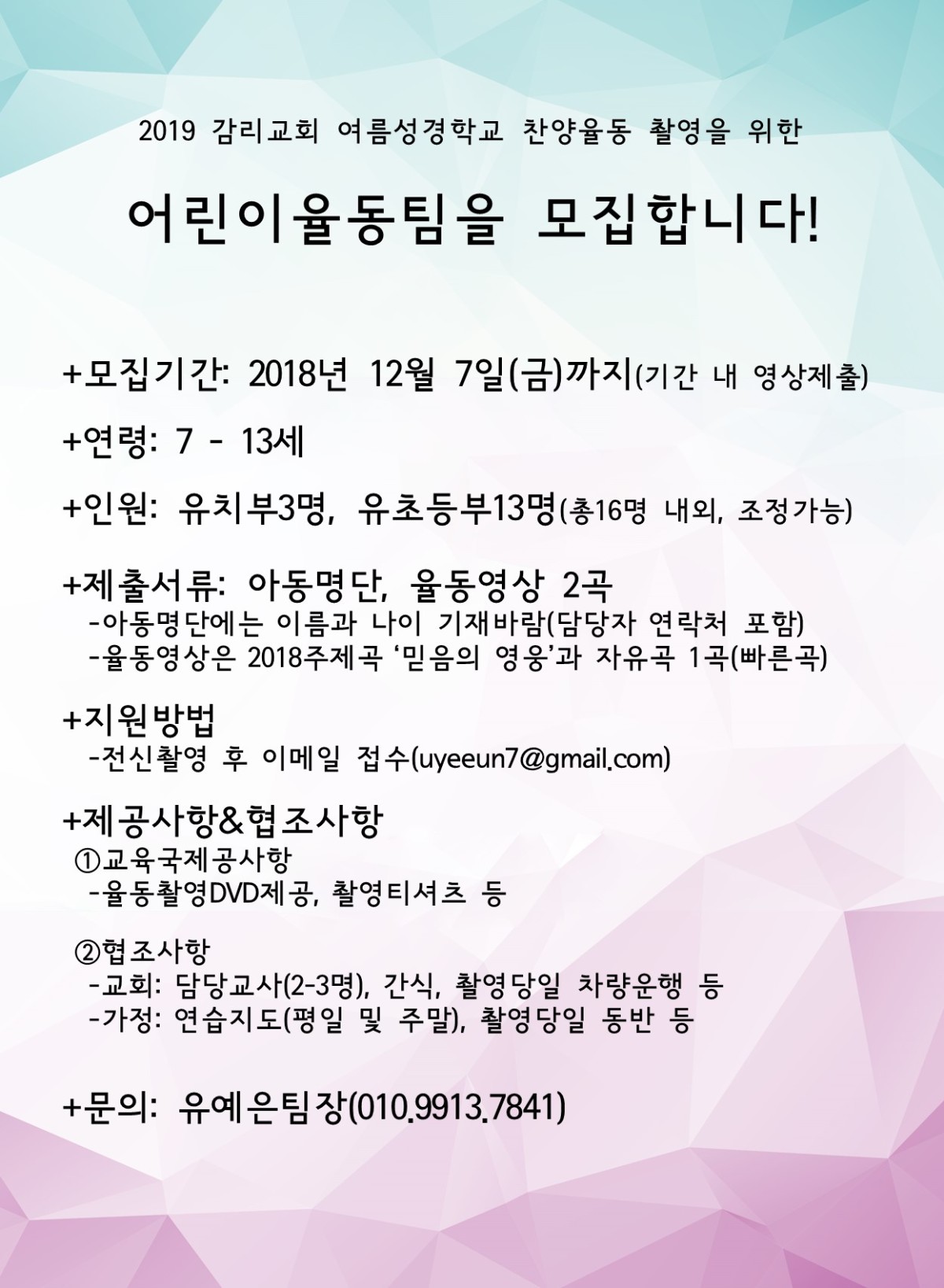 2019 감리교회 여름성경학교 율동위원을 선발합니다.