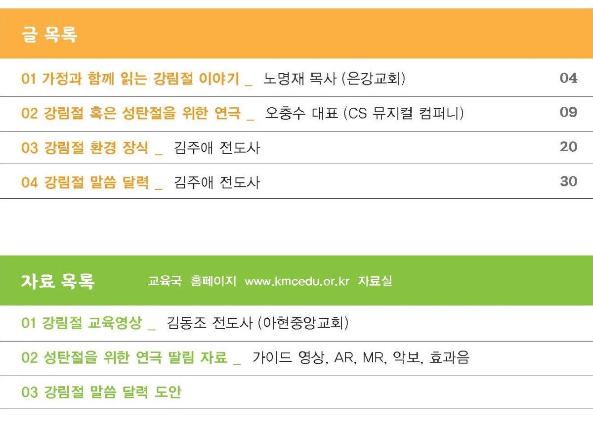 교육국 홈페이지 자료실에서 다운받아 사용하실 수 있습니다. https://kmcedu.or.kr/board/bbs/show.php?id=987&p_cate_id=40&category_id=41&group_code=bbs&pageID=&m_id=45 첨부파일 2018강림절교육자료집 표지.jpg 2018강림절교육자료집 목차-1.jpg