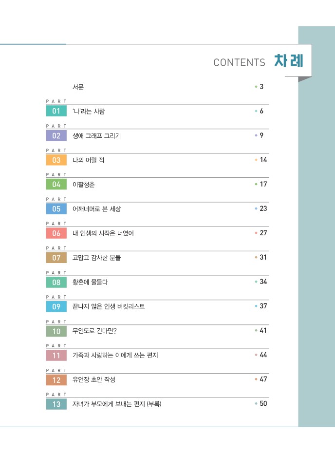 부모 스스로 작성한 「내가 쓰는 나의 인생 이야기」는 자녀들에게 부모님을 기억하고 부모님의 삶을 남길 수 있는 귀한 유산이 됩니다. 부모의 기록은 자녀에게 부모의 삶을 전수하는 좋은 매개체입니다. 삶의 위기를 극복한 부모의 경험은 자녀들에게 귀한 유산이 됩니다.