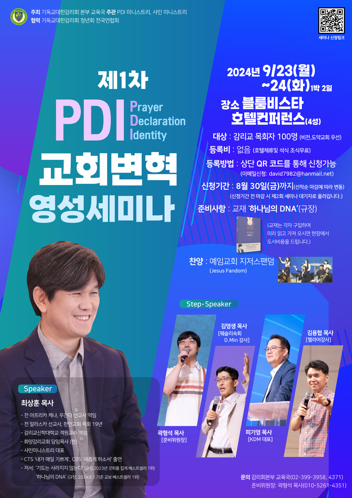 기독교대한감리회 본부 교육국(총무:김두범 목사)은 PDI 미니스트리와 함께 목회자의 영적 부흥과 교회변혁을 위한 ‘교회변혁 영성 세미나’를 준비하였습니다. 목회와 교회에 새로운 부흥의 불씨가 될 이번 세미나에 목회자들의 적극적인 참여를 바랍니다.
