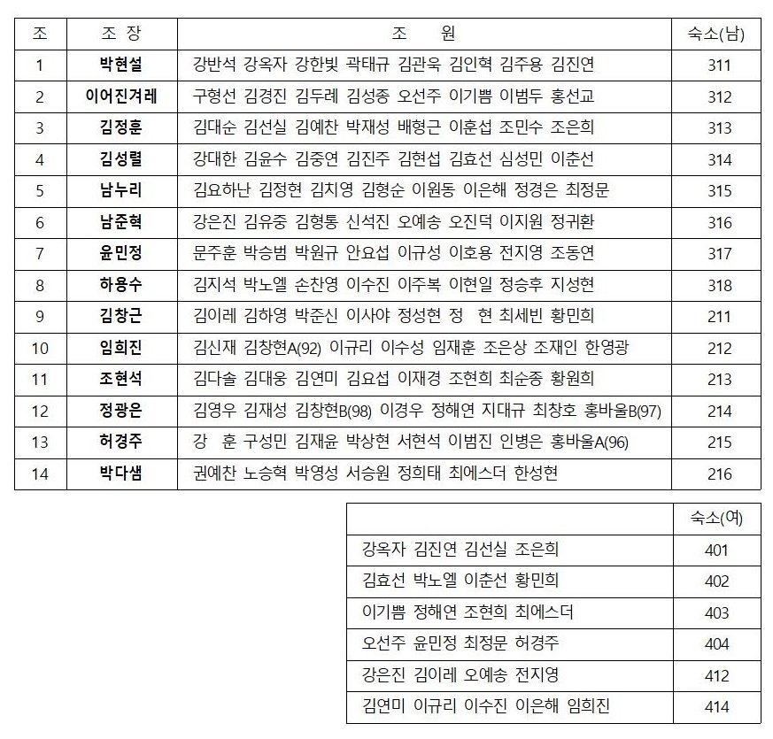 4) 영성수련회 조, 숙소는 아래에서 확인하세요!