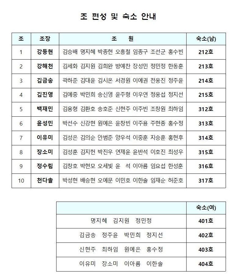 4) 영성수련회 조, 숙소는 아래에서 확인하세요!