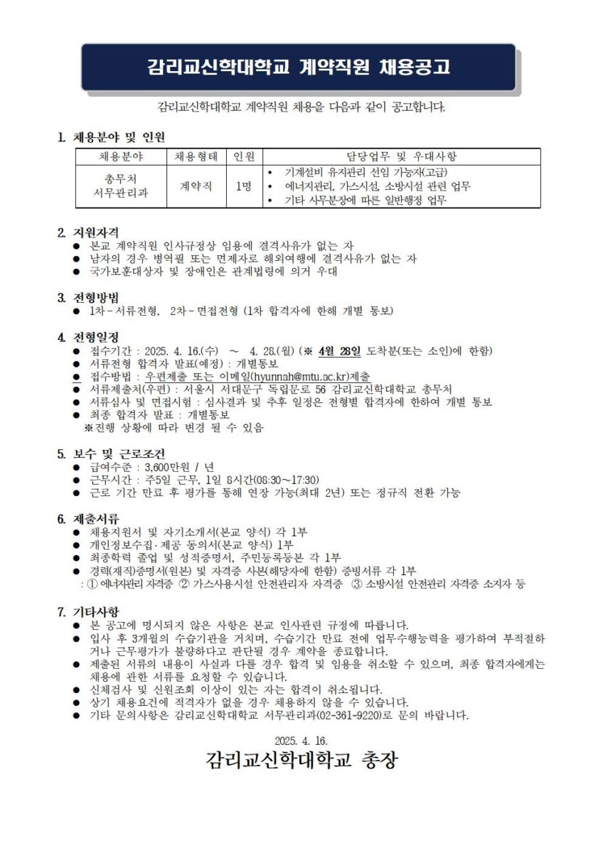 첨부파일 KakaoTalk_20250416_224826847.jpg 20250416-채용공고문총무처.pdf 직원채용-지원서서식_총무처-서무관리과기계설비-운전-및-유지관리와-일반행정-업무.hwp