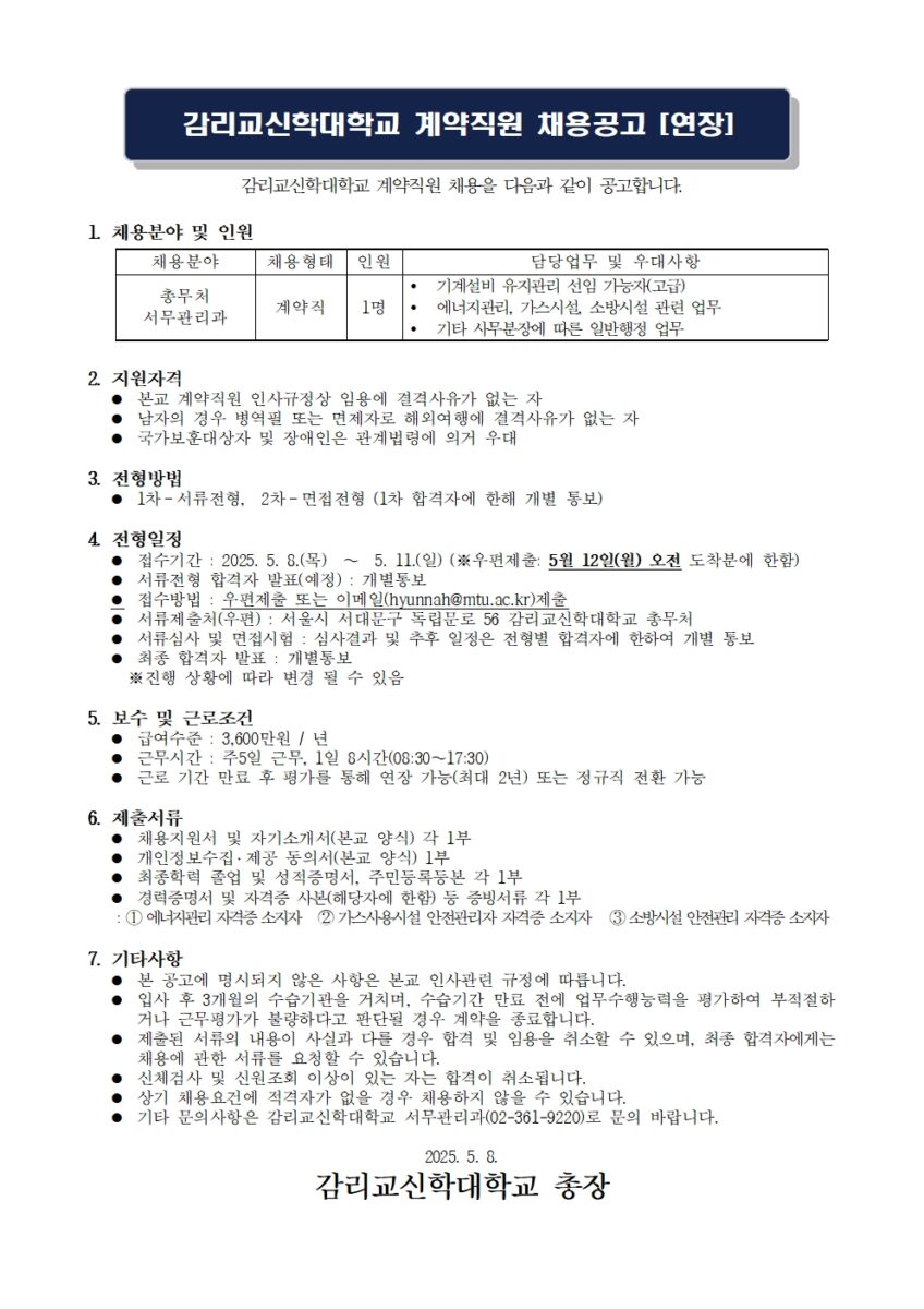 첨부파일 2025년_감리교신학대학교-계약직원-채용을-다음과-같이-공고합니다.총무처-서무관리과_기계설비유지관리_연장001.jpg 20250508-채용공고문_총무처_연장.pdf 직원채용-지원서서식_총무처-서무관리과기계설비-운전-및-유지관리와-일반행정-업무.hwp