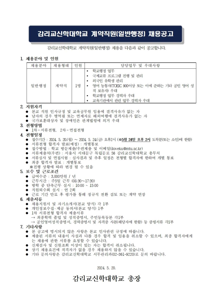 감리교신학대학교 계약직원(일반행정) 채용공고