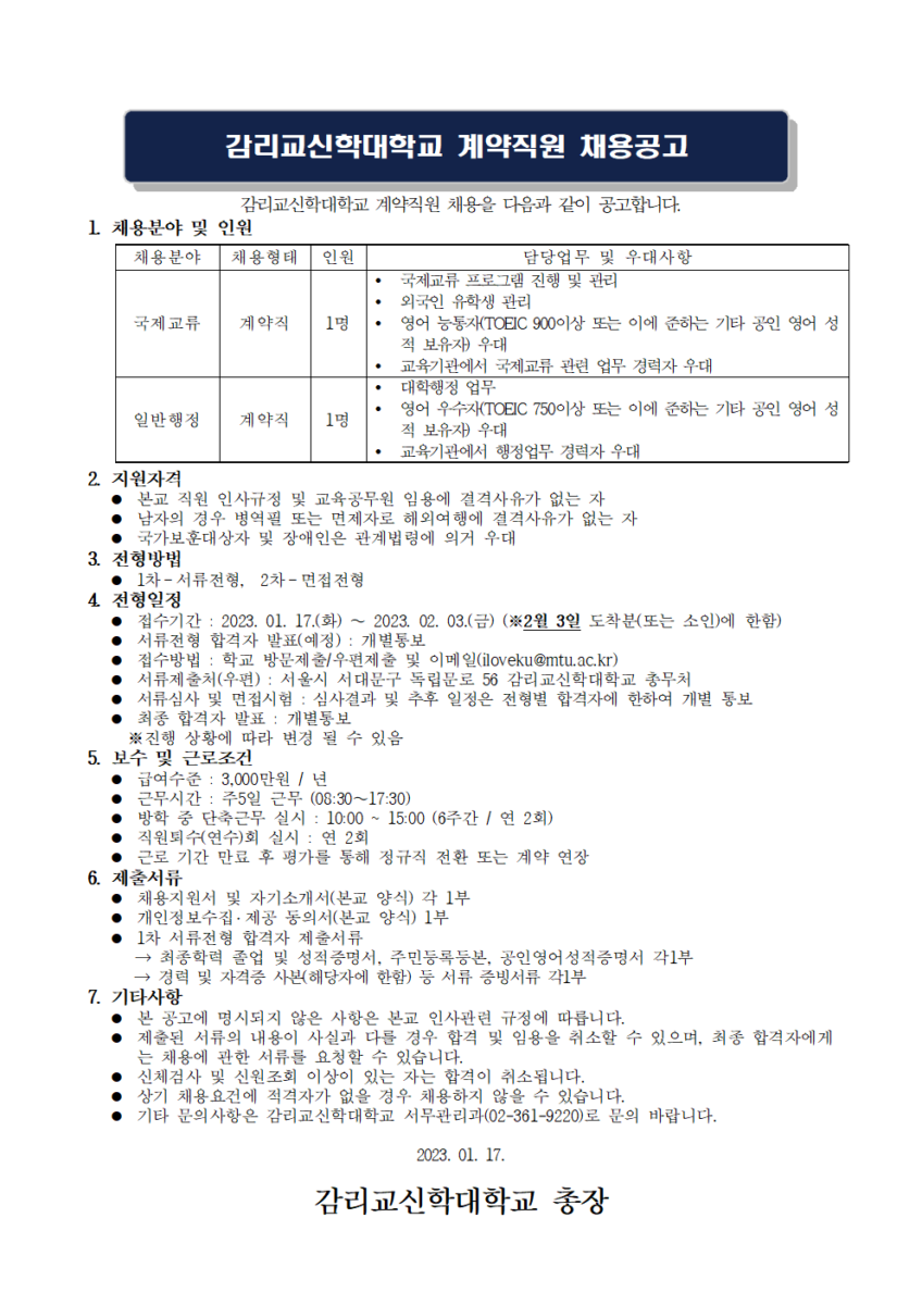 감리교신학대학교 계약직원(국제교류/일반행정) 채용공고