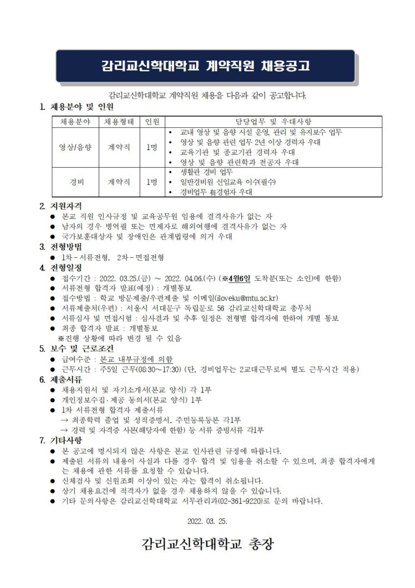 감리교신학대학교 계약직원(영상·음향/경비) 채용공고