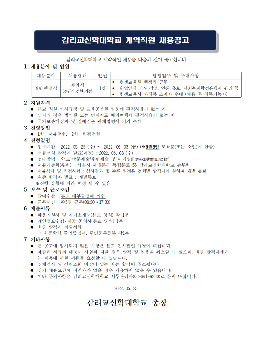감리교신학대학교 평생교육원 계약직원(정규직전환가능)채용공고