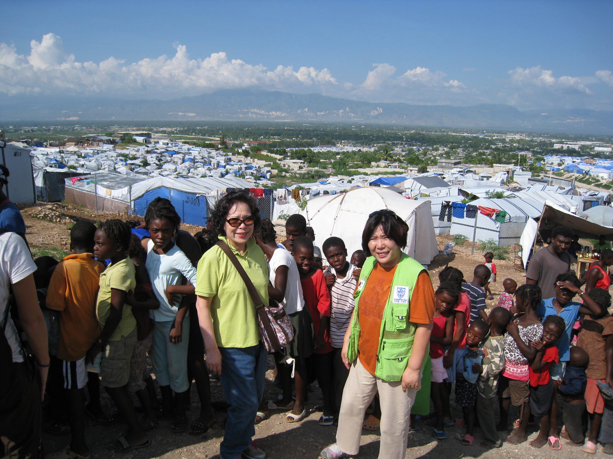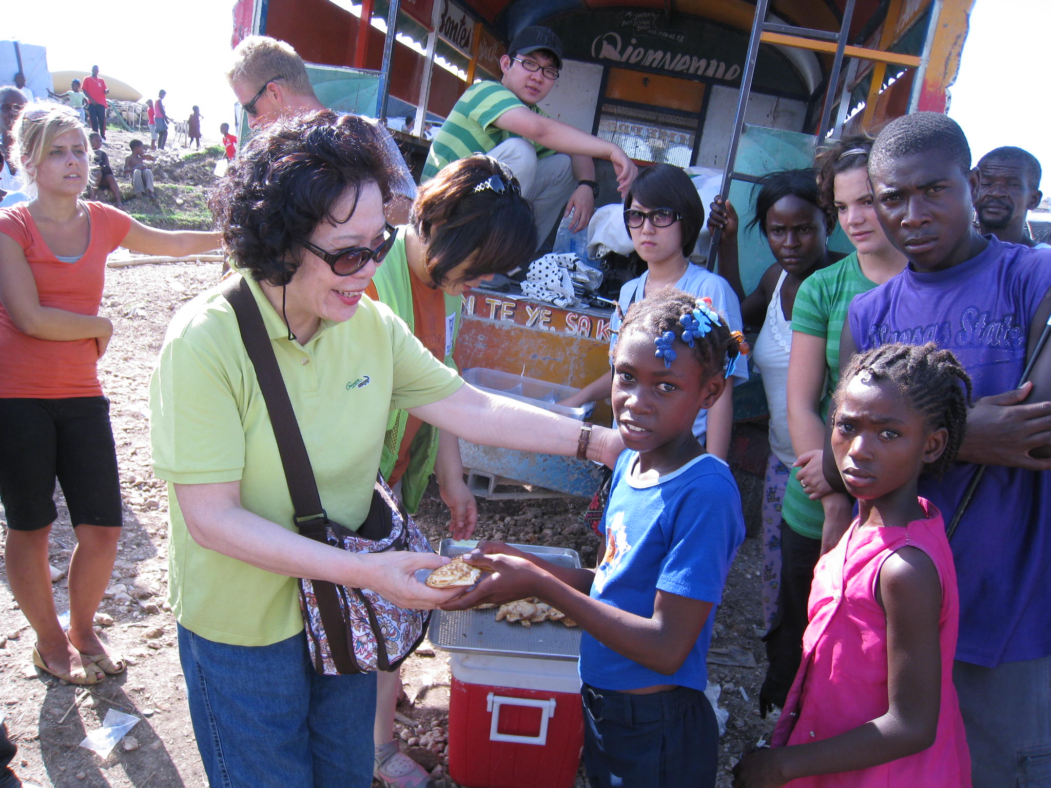 공항을 출발한 우리는 먼저 천막들이 밀집해 있는 지진 피해 지역으로 갔다. 누더기같이 더덕더덕하게 기워 놓은 천막들이 수백개씩 무리를 지어 널려 있는 천막촌 언덕에 한국 감리교 텐트를 쳐 놓았다. 그곳에서 감리교 빵 공장에서 구워온 빵과 현장에 빵 기구를 설치해서 구워주는 붕어빵을 미국에서 자원봉사를 온 예수 전도단 수십명 봉사자들이 서준석 선교사의 지휘에 따라 빵을 나누어 주고 있었다. 서준석 선교사는 너무 바빠 나에게 인사 못하니 나중에 인사하자고 말하고 사역에 열심을 내고 있었다. 아프리카에서 이주해온 흑인 원주민 아이들이 수백명 줄을 서서 빵을 받아먹고 있었다. 이미 오후 3시 30분이 넘었고 나는 비행기에서 먹을 것을 주지 않아 온전하게 점심을 굶은 탓에 그 아이들 뒤에 줄을 서서 빵을 받아먹었다. 손도 씻지 못하고 먼지 묻은 손으로 빵을 먹었는데 나도 아이티 원주민과 똑같이 굶주린 원주민의 모습이었다.