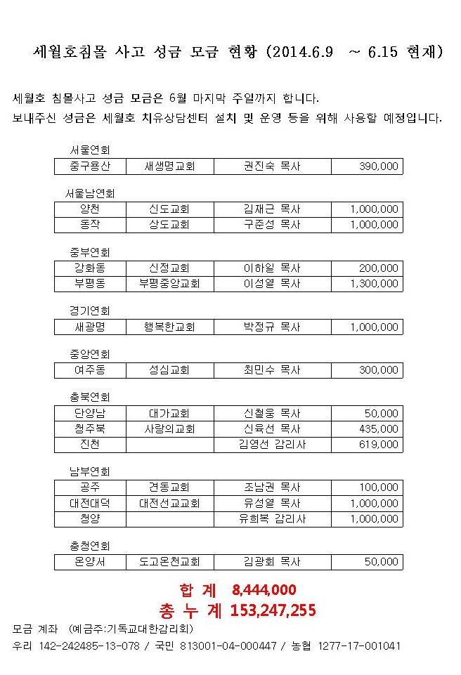 세월호 침몰사고돕기 성금 현황7(~6.15)