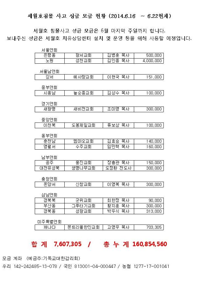 세월호 침몰사고돕기 성금 현황7(~6.15)