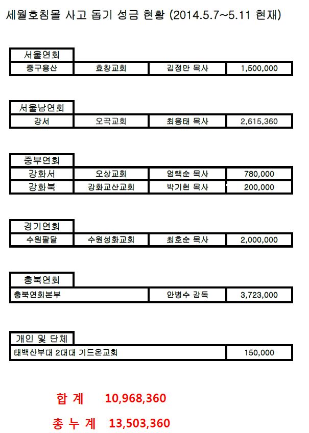 세월호 침몰사고돕기 성금 현황2(~5.11)