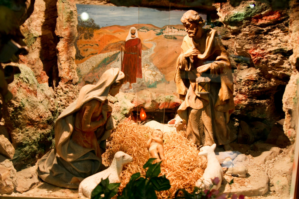 동굴 속, 마구간에 잠든 아기 예수 곁에