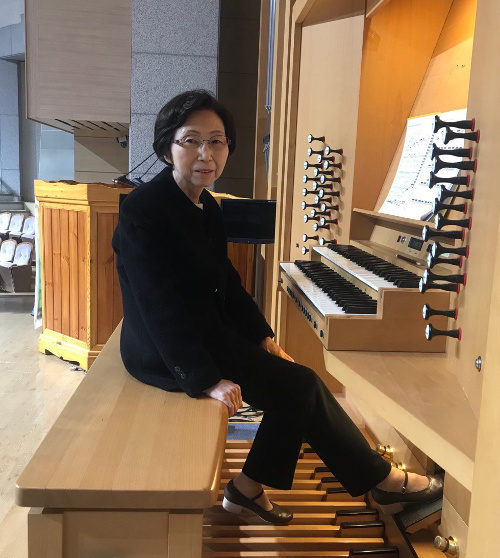 김혜순 전도사가 최근 서울 서대문구 감리교신학대 웨슬리채플에 있는 파이프오르간 앞에서 포즈를 취하고 있다. 김혜순 전도사 제공