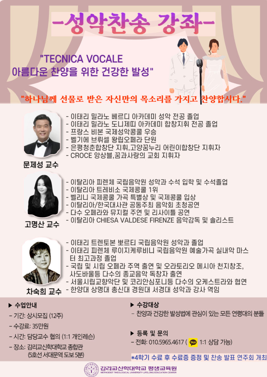 매주 수요일 오전과 토요일 오전 또는 저녁시간에 귀한 교수님들을 모셔서 열게 된 감신대 평생교육원의 성악강좌에 빠른 등록으로 풍성한 시간을 함께 나누길 바라며, 4학기를 채운 수강생들에게는 성악강좌 수료증 수여 및 감신대에서의 찬송연주회를 가지고자 한다. 아름다운 목소리로 하나님을 찬송하며 이웃을 섬기는 데에 큰 역할을 감당하리라 기대하며, 자주 오지 않는 귀한 기회에 필요한 주변분들에게 권하여 함께 수강하기를 바란다. 12주 수강료는 35만원이며, 수강등록과 문의는 010-5965-4617 카톡으로 가능하다.