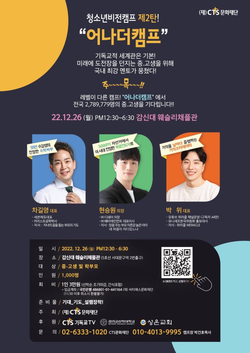 ‘어나더캠프’ 주강사는 전국 55만 수강생들의 ‘수학싸부’로 널리 알려진 세븐에듀 차길영 대표와 성공한 3천억 자산가이자 유튜브에서 복음을 전하는 사업가로 널리 알려진 ‘디쉐어’ 현승원 의장 그리고 전신 마비 고난 속에서도 일상의 기적을 만들어가는 기적의 크리에이터 ‘위라클’ 박위 대표가 전국 280만 중고생들에게 꿈과 비전을 심어줄 계획입니다.