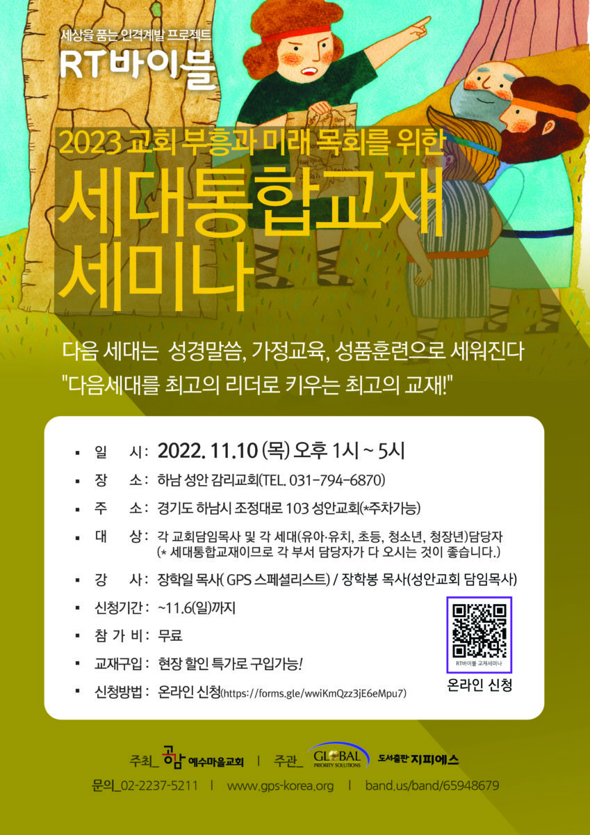 존경하는 장학일 목사님께서 수년동안 준비하신 [2023 교회부흥과 미래목회를 위한 '세대통합교재 RT바이블 세미나']가 있어 이를 소개합니다.