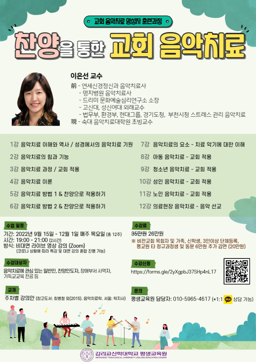 감리교신학대학교 평생교육원에서는 2021년 9월부터 [찬양을 통한 교회 음악치료] 과정을 성경 속 음악의 치유적 사용을 살피며 찬양을 통한 진정한 치유의 여정을 함께 나누고 있다. 하나님은 우리에게 음악을 주셨고 음악은 찬양, 회복, 감사, 기쁨의 표현 등 다양한 도구로 사용되어왔다. 특히 학문으로 자리잡은 음악치료는 음악의 다양한 방법들을 활용하여 정신과 신체의 건강을 돕고 삶의 질을 높이기 위한 치료의 과정으로 전문분야가 되었다. 음악치료는 병원, 복지관, 지역센터, 학교 등에서 다양하게 치료적 도구로 사용되고 있으며 다양하게 적용되고 있다.