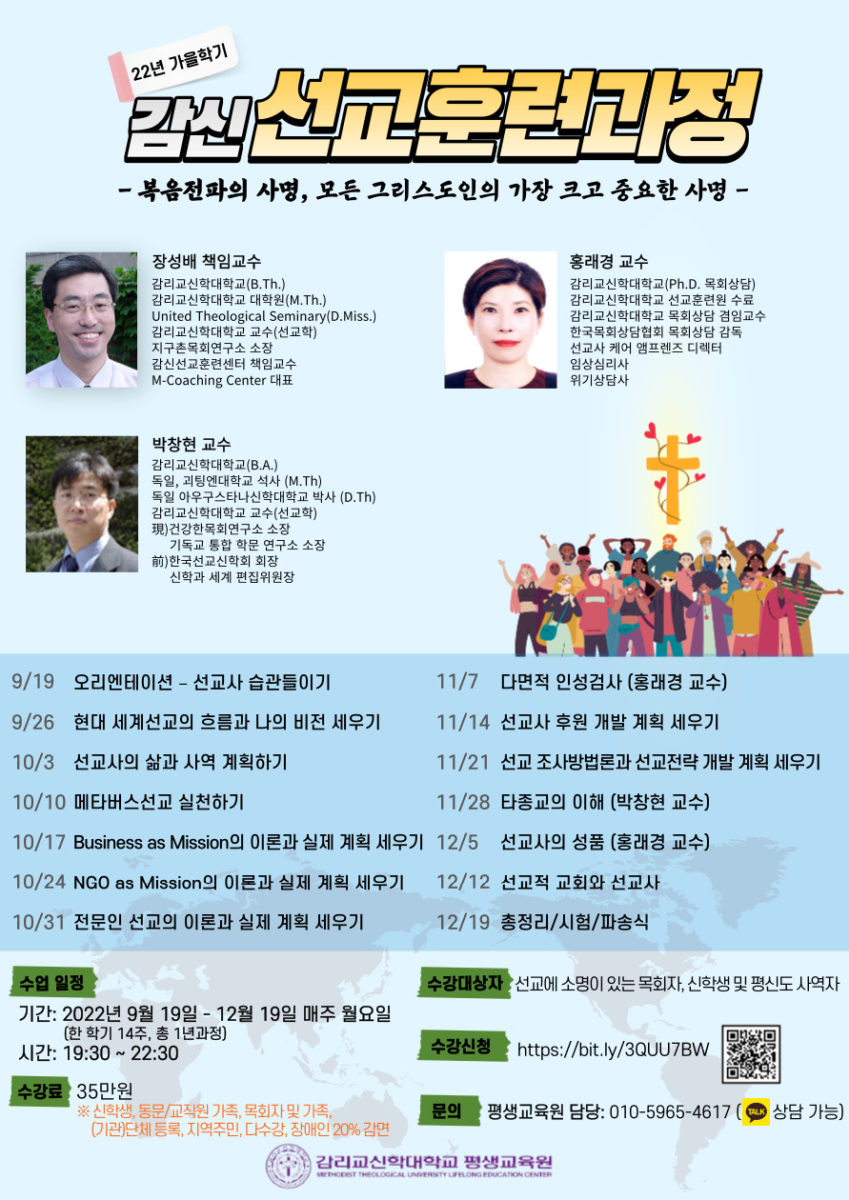 감리교신학대학교 평생교육원에서 진행하는 ‘감신선교훈련과정’이 9월 19일 개강한다. 본 과정은 한 학기 14주씩 1년 과정으로 진행된다.