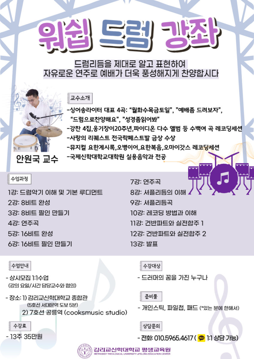 감리교신학대학교 부설 평생교육원(이하 감신대 평교원)에서 ‘Worship Drum Class(워쉽드럼강좌)’를 상시모집 한다. 예배음악 속에 드럼을 다양하고 세련된 표현들로 어떻게 채워갈지 배우는 과정이 될 것이다. 교회 예배 드러머가 되기를 원하는 사람, 취미 드러머로 다이나믹한 리듬의 빠져들고 싶은 사람, 프로 드러머가 되길 희망하는 모두를 환영한다.