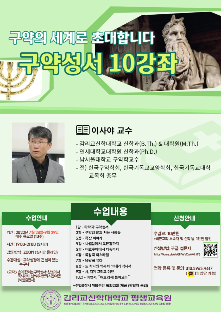 감리교신학대학교 부설 평생교육원에서 이사야교수를 강사로 ‘구약성서10강좌’를 온라인으로 진행한다. 이사야교수는 감리교신학대학교와 동대학원을 졸업하고, 연세대대학원에서 구약학으로 박사학위를 취득한 후, 한국구약학회를 비롯한 다양한 학회 활동과 강의를 하고 있는 굴지의 학자이다. 그의 다양한 경험과 지식을 본 과정을 통해 나눌 수 있는 기회가 될 것이다.