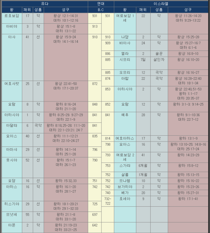 *도표는 유다와 이스라엘의 역대 왕조 도표로 어떻게 하나님의 신실한 여수룬이 불량자로 바뀌었으며 하나님의 보호가 떠난 이스라엘과 유다의 종말이 무엇인지를 보여준다 우리도 여수룬일 때 하나님이 지키시지만 불량자로 변해가면 결국은 망하는 백성이 되고 만다 두려워하며 하나님을 섬길 일이다