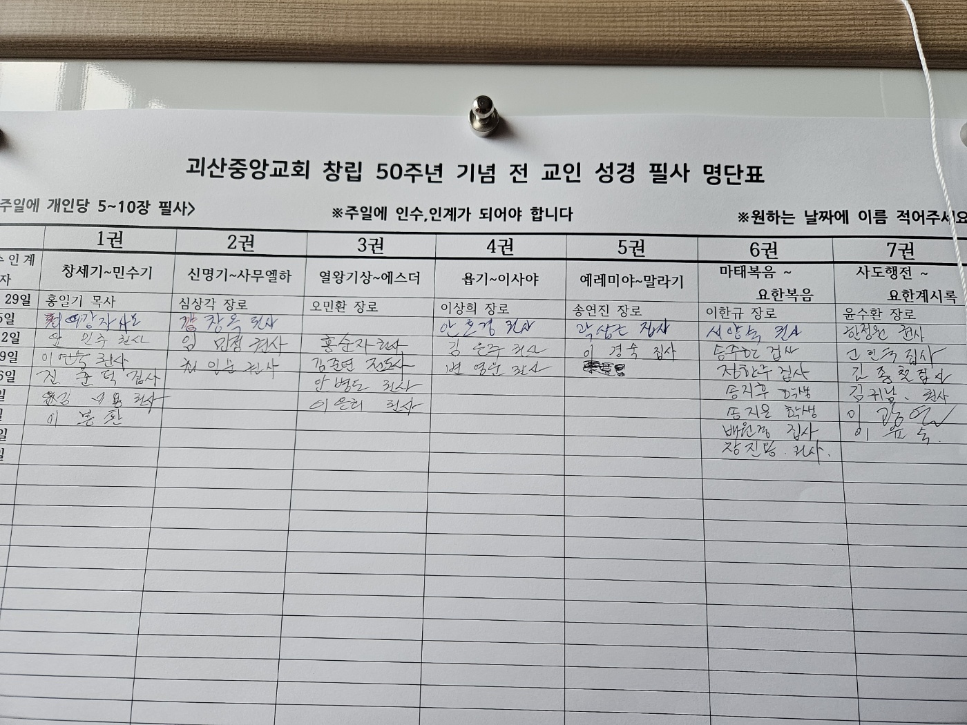 50주년 기념 행사 1차로 전 교인 성경 필사로 강단에 놓을
