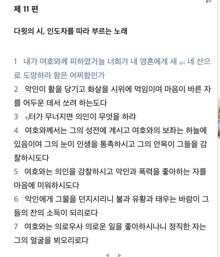 (시편 11:1-7) 주께 향한 믿음에 의심이라니요? 어리석다면 모를까. 악을 피할 수 있나요? 도망갈 길은 산으로 가로막혔습니다. 악한 자의 활은 기왕에 죄 없는 사람을 맞히려고 어둠 속에 숨어있습니다. 모든 것이 산산이 깨졌을 때라면 선한 사람이 할 수 있는 일이 있나요? 주의 몸은 거룩하시니 우리 속에 있으며 그의 왕좌는 고귀하여 하늘 높답니다. 어디서나 사람들을 지켜보시지요. 그들이 무엇을 하고 있는지 아십니다. 선과 악을 동일선상에 놓으시고 검토하며 불법을 진심으로 미워하십니다. 그는 불타는 석탄과 뜨거운 유황을 사악함에 쏟아붓고 맹렬한 바람으로 처벌하십니다. 주님은 정당하시기 때문에 선한 행위를 사랑하십니다. 믿음은 주와 같이 살도록 합니다.