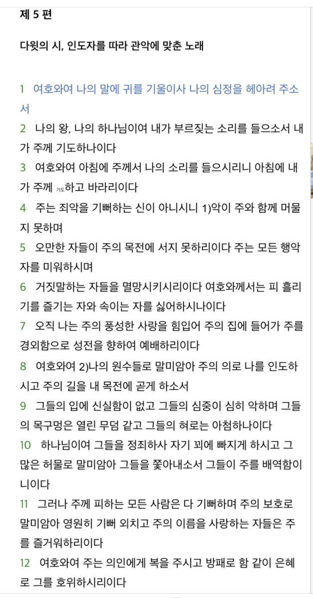 지금 이 아침 내 전부로 주께 간청드립니다. 내 원하는 바가 세월의 흐름에 바랄까나. 강렬한 태양에 사그라들까나. 숨이 꺼진들 그칠까나. 하루 종일 일평생 동안에 간구하오니 나의 하나님 나의 왕 내 기도를 들으시사 응답하소서. 내가 당신을 모르고서야 어찌 구하리요. 당신 면전에서는 허용되지 않는 죄악. 그것과 같이 만족스럽다 하지 않으시는 분. 그 교만함 그 광경을 견딜 수 없다 하십니다. 사기치는 자들은 부숴버리니 그들의 거짓의 악함을 미워하십니다. 나는 당신의 위대한 사랑 그 거룩함을 예배하오리이다. 그런데도 주여 적들이 무리를 짓습니다. 주께서 바라시는 삶은 그리 녹록치 않겠지요. 그러니 뜻을 따라 행하도록 당신의 계획을 보이시옵소서. 적들은 죽이고자 말합니다. 그 알랑거림에는 치명적인 속임수만 가득 차있습니다. 그들만의 음모가 스스로를 속였고 자신을 파멸에 이르도록 합니다. 하는 말은 거짓투성이 반항으로 인해 하나님 면전에서는 쫓겨났습니다. 사랑의 위대함은 한숨을 잠재우고 그 분노를 가로막아 답을 열어두셨지요. 난 당신만을 믿으니 내 간구를 사랑을 노래하는 기쁨으로 삼습니다.