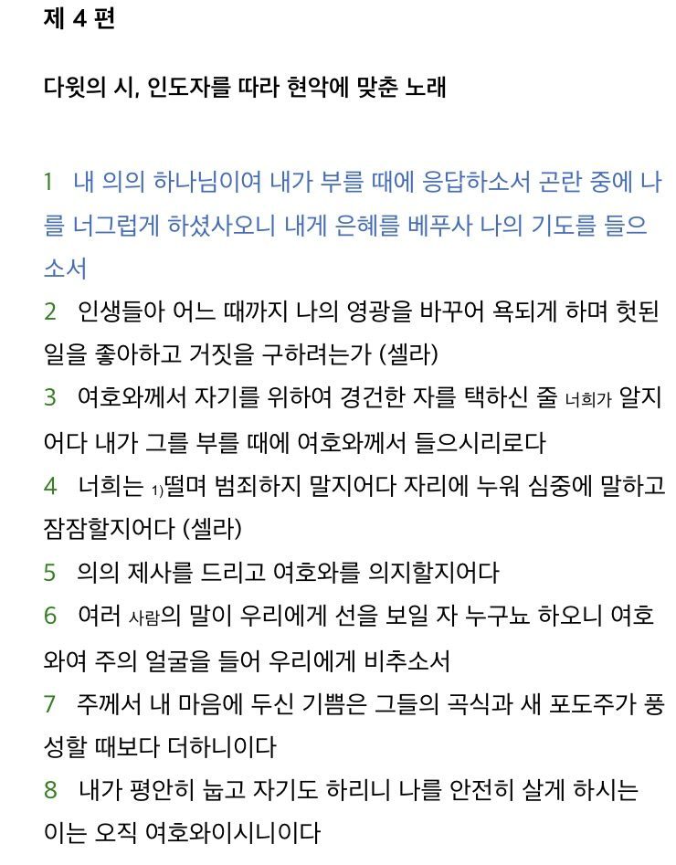 날 지키시는 하나님, 기도드리오니 응답하소서. 곤란한 처지에서는 내게 대답을 주시는 하나님, 지금 내겐 선한 얼굴이 얼마나 절실한지. 간구에 귀를 기울이소서. 사람들이 얼마나 더 나를 모함할까요? 그들이 얼마나 더 헛된 것을 사랑하며 거짓을 따를까요? 끝이 없지요. 눈을 뜨고 있는 한은 계속될 것입니다. 기억나십니까? 하나님께서는 하늘의 의를 위해서 날 택하여 부르셨으니 내가 부르는 소리를 들으십니다. 하나님의 정의는 잘하기 때문에 잘 사는 것인데 잘못하는데도 잘 산다고 여겨집니까? 그 평가는 인간의 잘못된 기준이니 이 세상을 낙원으로 만드시는 하나님의 입장에서 본다면 어떨까요? 모든 게 순조롭다면 하나님과는 거리가 멀다고 보면 됩니다. 수고 하십니다. 두렵기도 떨리기도 하지요. 죄악을 멈추고 주님 앞에 누워서 조용하시고 당신 자신을 주께 제물로 드리세요. 그리고 주님을 믿으세요. 많은 사람들이 주여 우리에게 선한 얼굴을 대하시고 더 많은 복을 내려주십사 기도합니다. 그러나 내게 주신 기쁨은 그들이 곡식과 포도주를 많이 거둬 얻은 수확의 기쁨과는 비교할 수 없습니다. 내가 평안히 눕고 자기도 하려니와 잘 살게 하시는 이도 오직 여호와시니이다.
