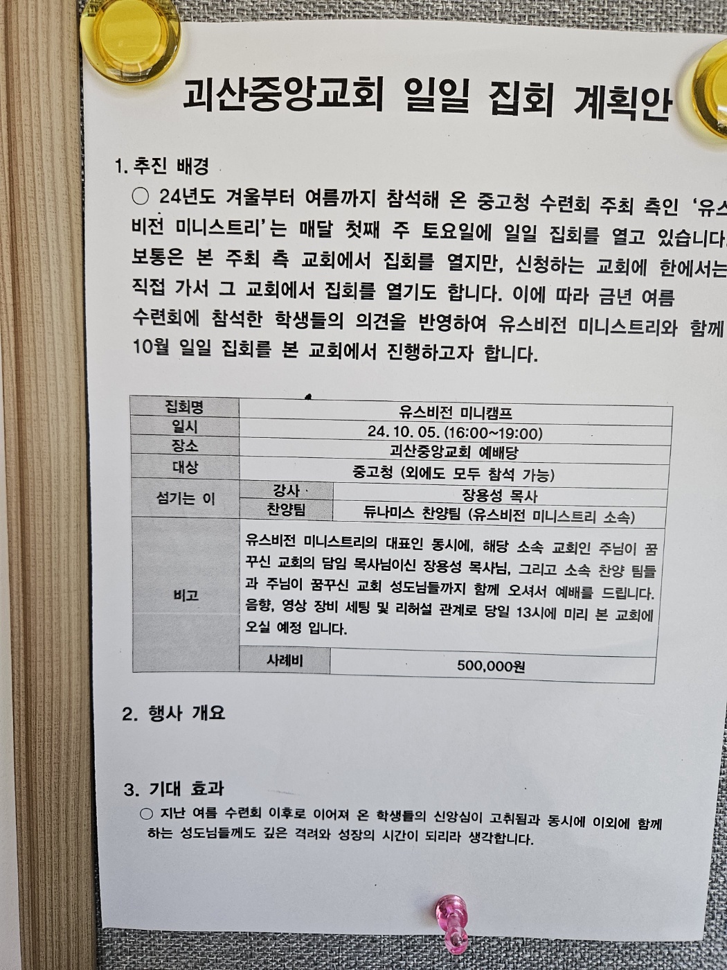 주일 아침 장로님들과 상의하고 1. 2부 예배 시 광고 하고