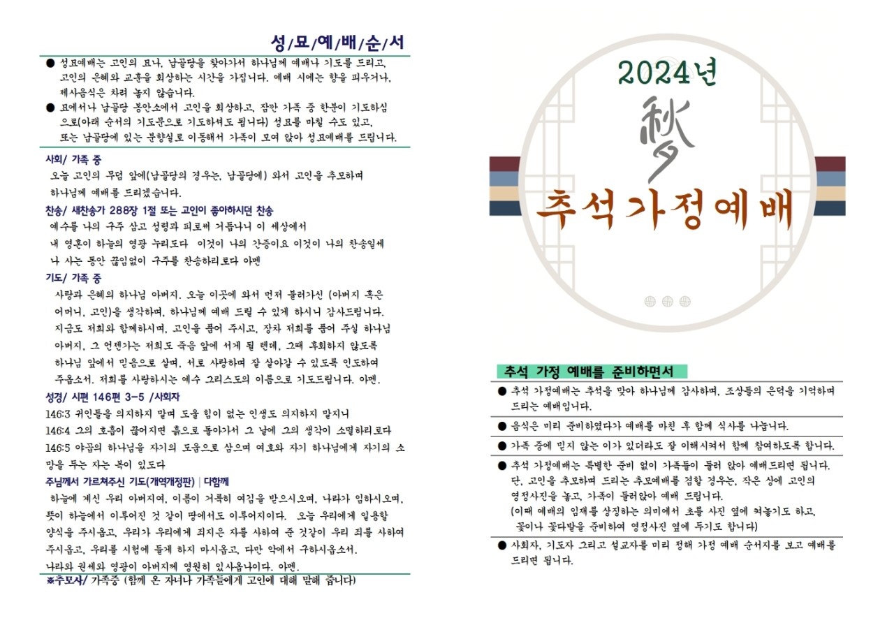 내일 오후 예배는 추석 명절로 가정 예배로 드리시고 추석 날은 추도 예배 예문을 준비 했으니 사용 해 주세요. 추석 명절 기간 새벽 기도는 추석에대한 말씀을 전합니다. 함께 동참 해 주세요.