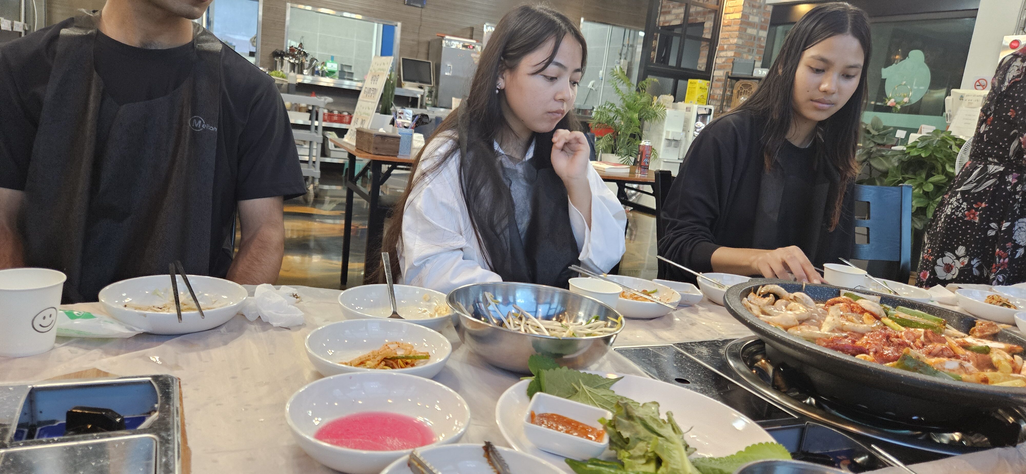 저녁 식사 후 기념 사진도 촬영하고 외교관 딸이 와서 통역을 하면서