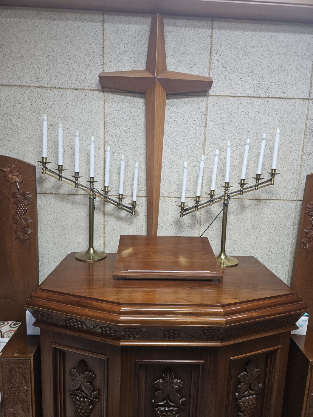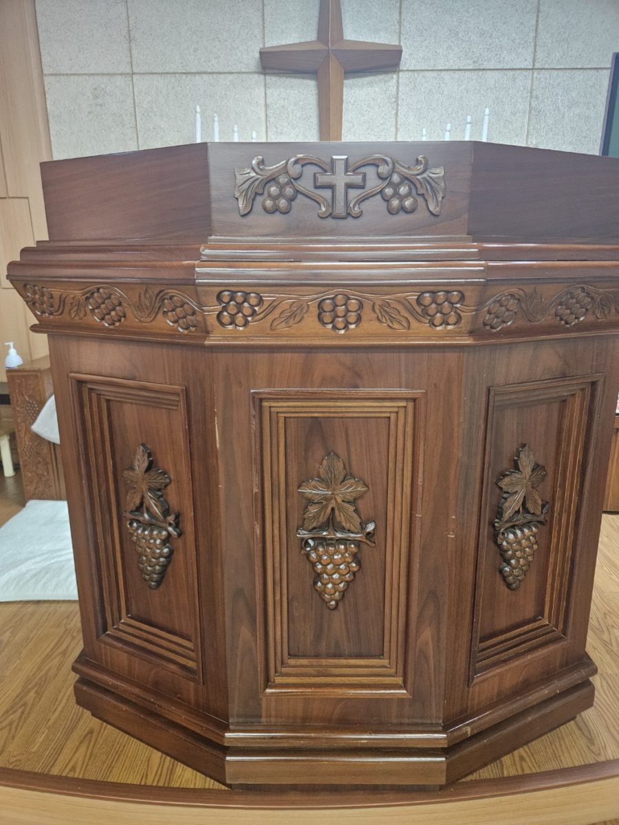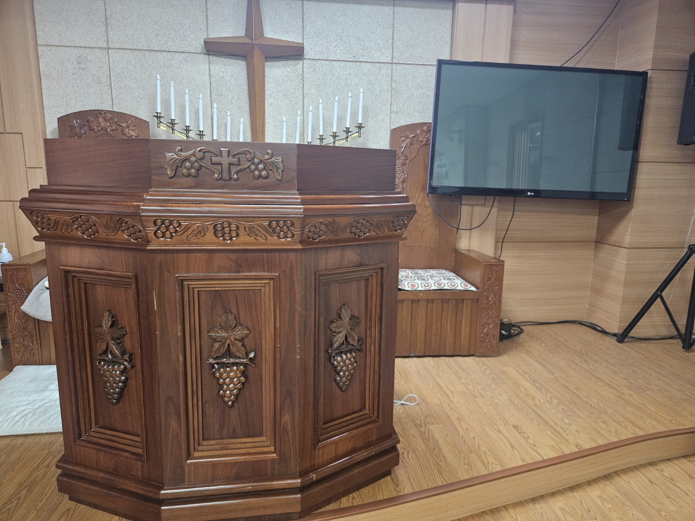 작은 강대상 , 성경대 , 의자 2개 십자가 헌금 대