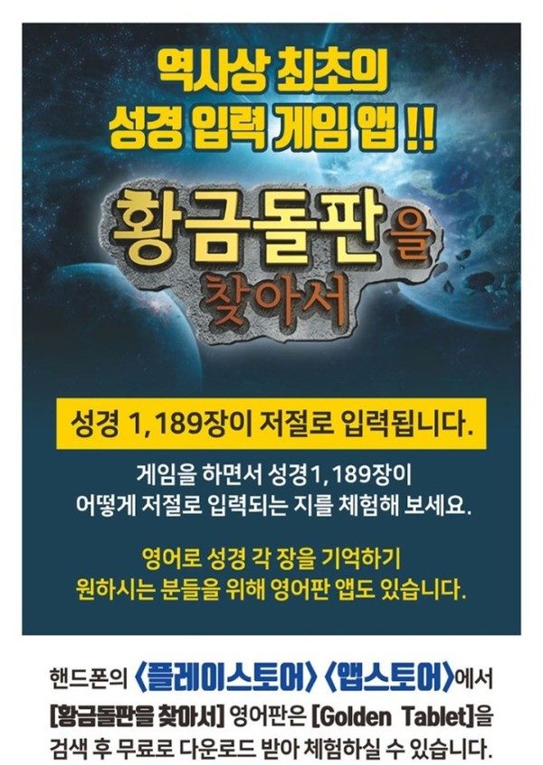 2006년 당시 성경 66권 각 권을 쉽게 이해하고 파악하도록 각 권에 흐르는 전체적인 내 용과 장제목을 체계적으로 정리해서 출판한 [네비게이션성경]에 기반한 <황금돌판을 찾아서> 은 누구나 각 권의 내용을 한 눈에 파악할 수 있는 성경통독 학습 툴(tool)로 다음세대 성경교육에 혁명적인 일로 감리교회의 부흥과 성장에 기여할 것으로 기대됩니다.