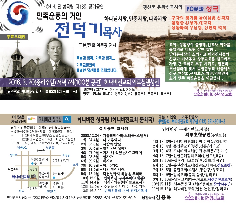 하나비전교회 성극팀의 13번째 작품인 "민족 운동의 거인 전덕기 목사" 및 성극팀 공연에 관한 더 많은 정보는 성극팀 카페, http://m.blog.daum.net/_blog/_m/articleList.do?blogid=0g6MX&categoryId=1 에서 확인하실 수 있습니다.