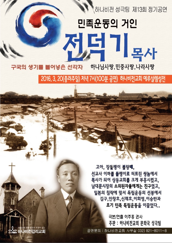 2016 부활의 감격을 준비하는 종려주일 저녁 공연되는 "민족 운동의 거인 전덕기 목사"에 관심있으신 성도님들과 목회자분들의 많은 관람을 바랍니다.