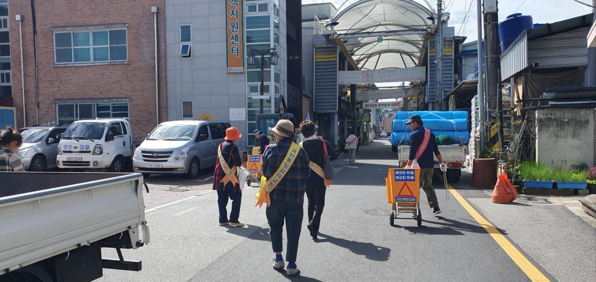 나가 괴산읍 내 거리 청소 하며 전도를 한다.