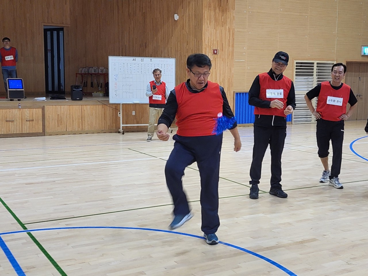 본 경기 들어가기 전 몸 풀기로 국민 체조를 하고 청팀 홍팀 백팀 3팀으로 나누어서