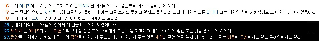 16. 내가 아버지께 구하겠으니 그가 또 다른 보혜사를 너희에게 주사 영원토록 너희와 함께 있게 하리니