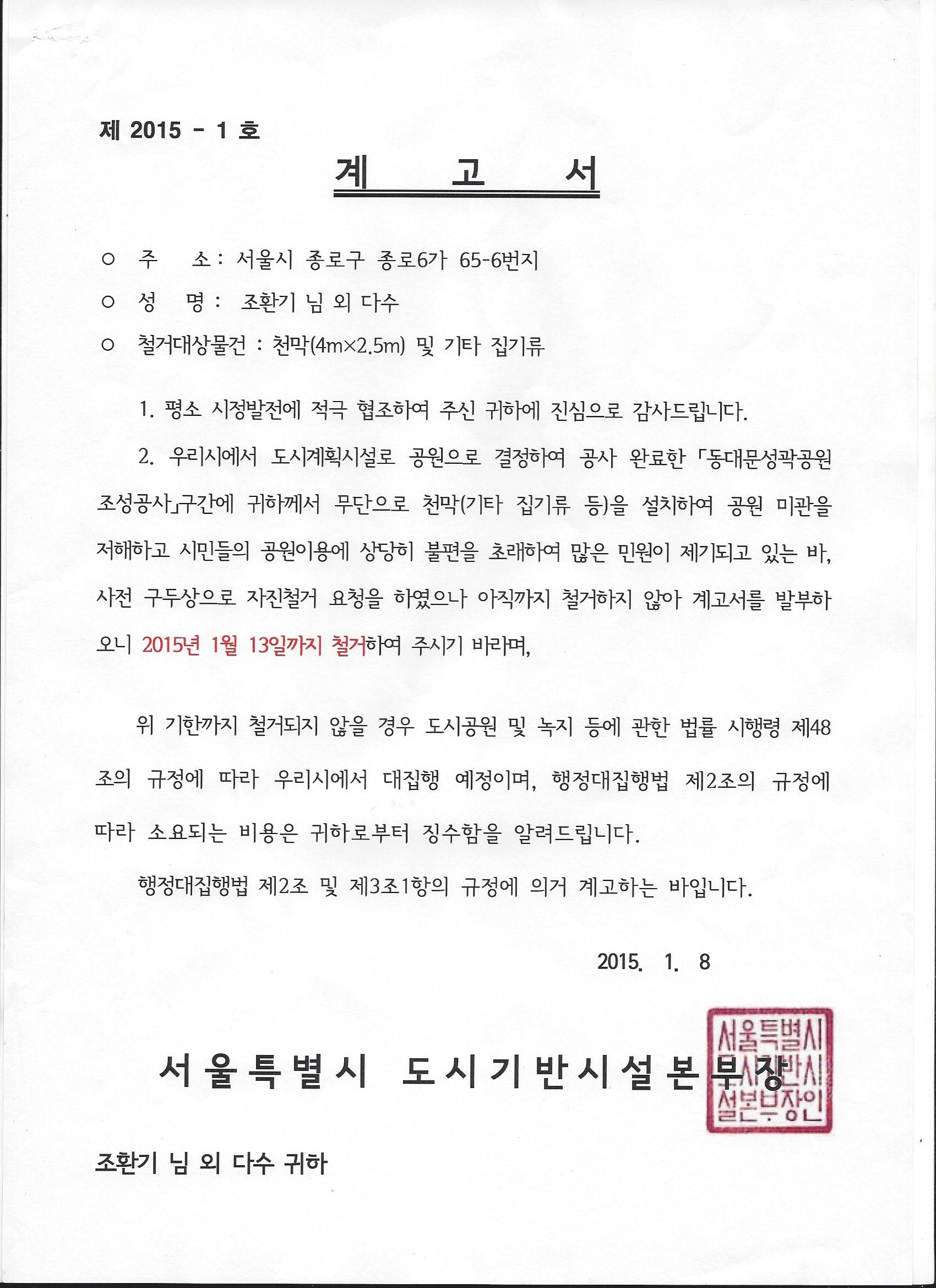 2015.1.9. 동대문 성곽공원내 천막철거 행정대집행 계고
