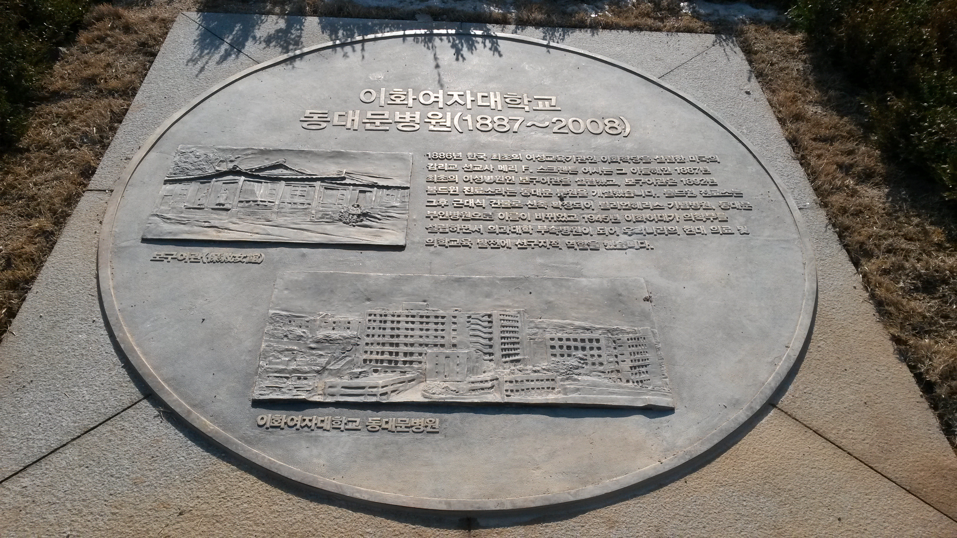 마지막으로 남아있던 "ㄱ"자 한옥 건물이 철거된 후 처음 옛 터를 찾은 것이었는데 만감이 교차했습니다. 씁슬한 마음으로 성곽 주변을 걸었습니다. 눈부신 햇살 사이를 비집고 눈에 들어온 보구여관과 이대동대문병원 안내 동판! 혹시 동대문교회에 관한 안내 동판이 어디 있는가 이리 저리 둘러보았지만 어느 곳에서도 기념 동판(서울시가 약속한 것이었으나...)은 찾아볼 수 없었습니다.