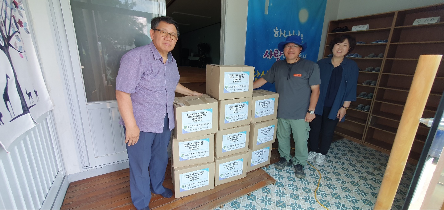 수해 피해 지역 위문 이담리 생활 키트와 수건을 신성교회 생활 키트 전달하고
