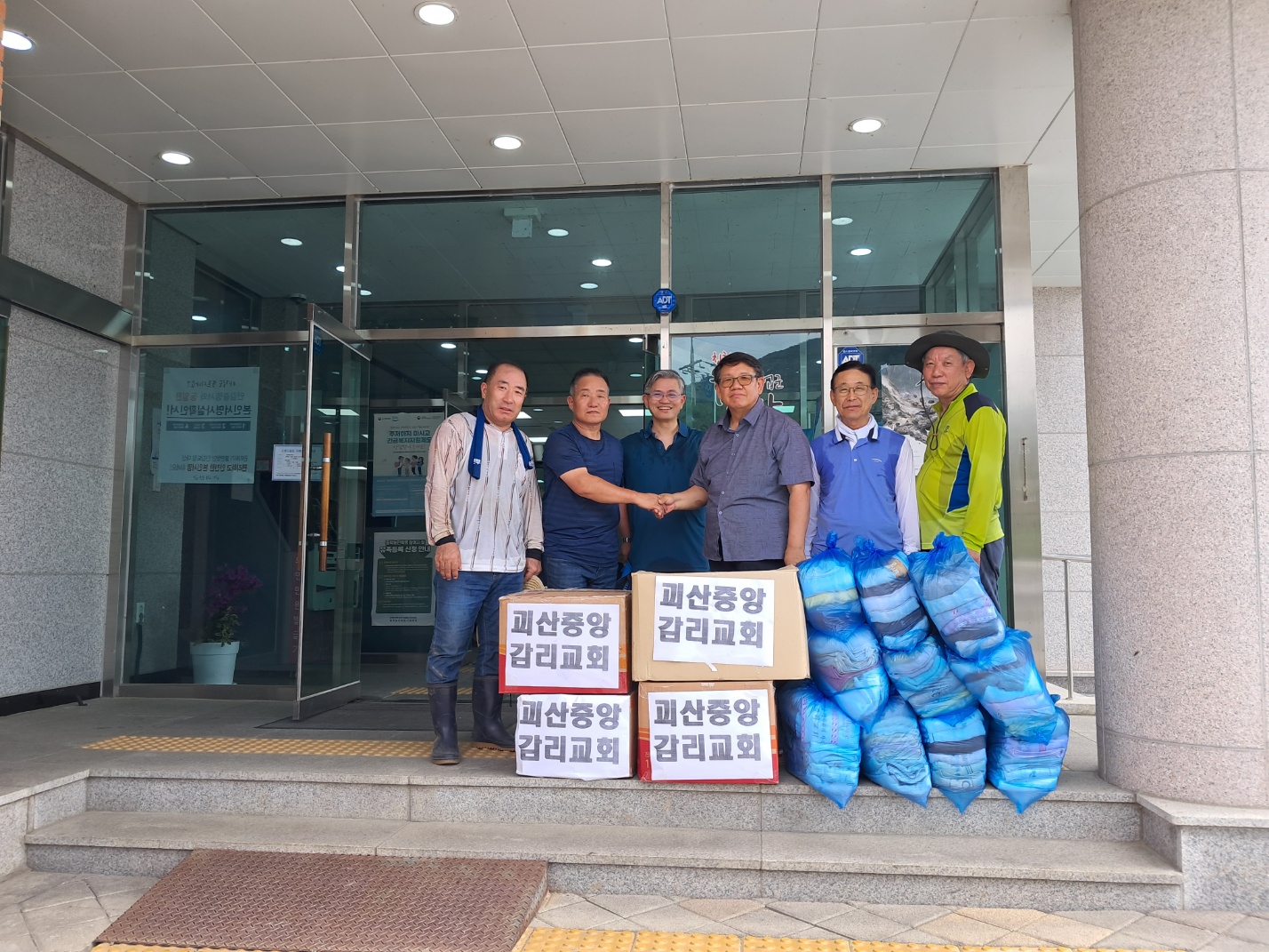우리 교회에 정리한 수건 500장을 불정면 사무소에 공급하고